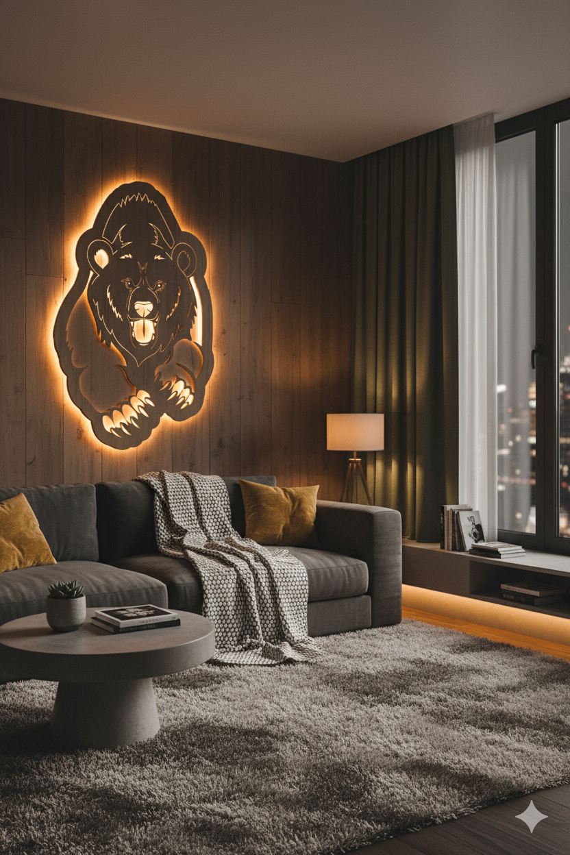 Ayı Model Ahşap Işıklı Duvar Dekoru, doğal ahşap malzemeden üretilmiş ve sıcak tonlu LED ışıklarla tamamlanmıştır. El işçiliğiyle hazırlanmış bu dekoratif parça, hem şık bir tasarım objesi hem de yumuşak bir aydınlatma kaynağı olarak kullanılır.