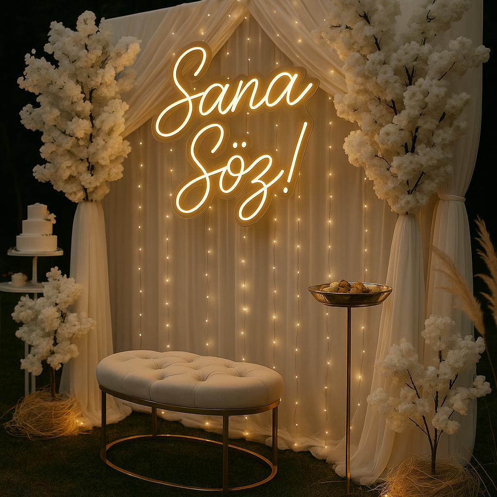SANA SÖZ Neon Tabela 50×40 cm, sevgi, bağlılık ve verilen sözü simgeleyen kısa ama güçlü mesajıyla özel gün dekorasyonları için özel olarak tasarlanmıştır. Söz, nişan ve evlilik konseptlerinde fotoğraf alanlarında estetik ve duygusal bir odak noktası oluşturur.