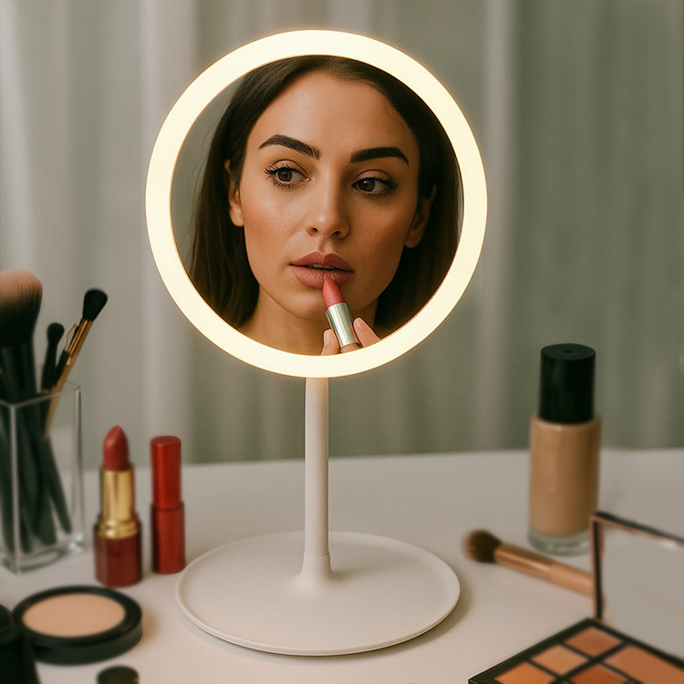 Yuvarlak LED ışıklı dokunmatik makyaj aynası, estetik yuvarlak formu ve LED aydınlatması ile hem fonksiyonel hem dekoratif bir üründür. Çevresini saran LED ışık halkası, makyaj veya cilt bakımında 3 farklı ışık modu ile size en uygun aydınlatmayı sağlar: doğal ışık, sıcak ışık ve soğuk ışık seçenekleri mevcuttur. Dokunmatik paneline kısa dokunuşla ışıkları açıp kapatabilir, uzun basarak ışık parlaklığını dilediğiniz seviyeye ayarlayabilirsiniz.